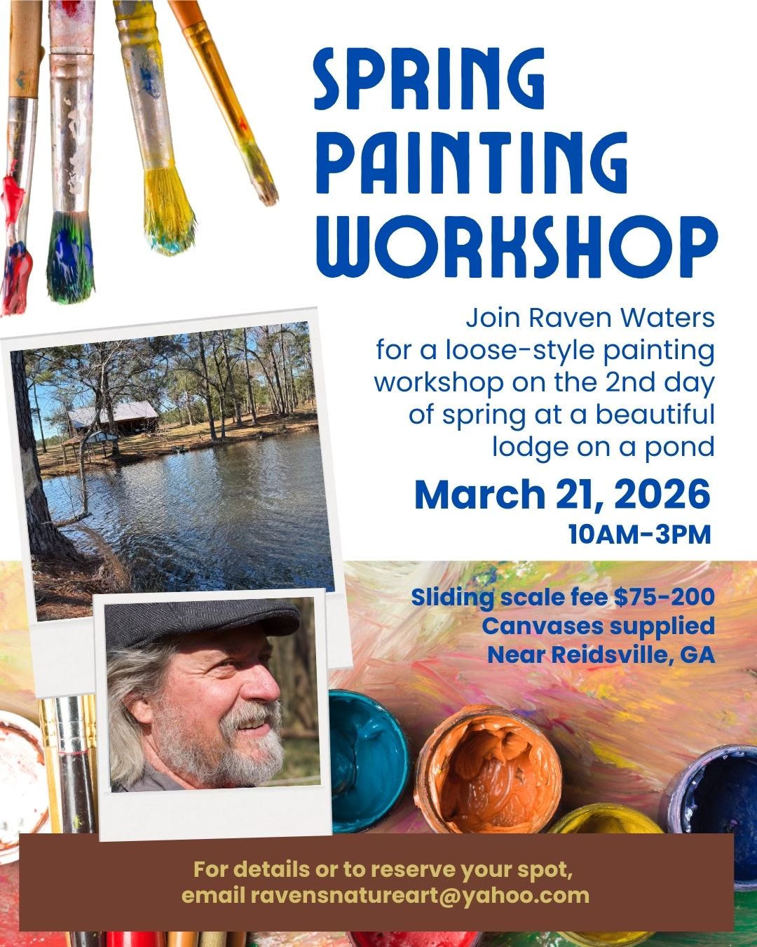 The workshop will be held at a beautiful, hidden hunting lodge located on Old River Road in Toombs County, Georgia. The interior of the two-story lodge is made of pecky cypress. We will be painting on a large, screened back porch with a tile floor. This lovely space overlooks a historic pond and a woods.